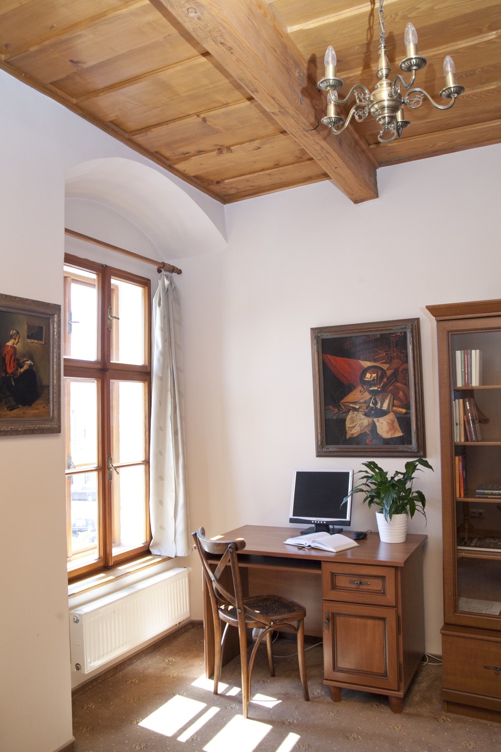 Chambre avec vue sur la charmante place depuis la fenêtre surélevée.